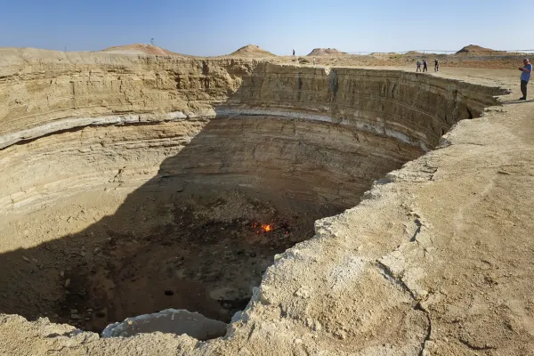 Apareció en 1971, cuando durante una perforación el suelo se derrumbó, formando una enorme caverna de gas. El gas se encendió para detener la fuga, y el fuego ha estado ardiendo durante más de 50 años.