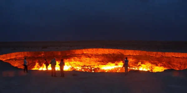 - Dzień 2: Daszoguz — Izmukszir — Darwaza. Poranne zakupy na wschodnim bazarze i podróż do twierdzy Izmukszir. Wieczorem czeka nas niezapomniany widok — płonący krater Darwaza („Wrota Piekieł”). Noc w jurtach pod gwiaździstym niebem.